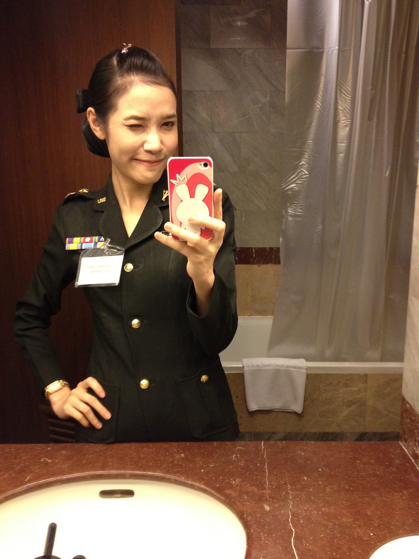 Although Koi was now officially a lady-in-waiting for Srirasmi, this was just a fiction to give her a position in the palace as a member of Vajiralongkorn’s harem, and while he was away in Germany she had little work to do, so she continued as a nurse at Ananda Mahidol Hospital for a while. She made it clear to everybody that her status had changed, wearing a badge with the image of Vajiralongkorn’s autistic son Dipangkorn that is known in Thailand to be a signifier of membership of Vajiralongkorn’s inner circle. Here’s an image from December 2012.