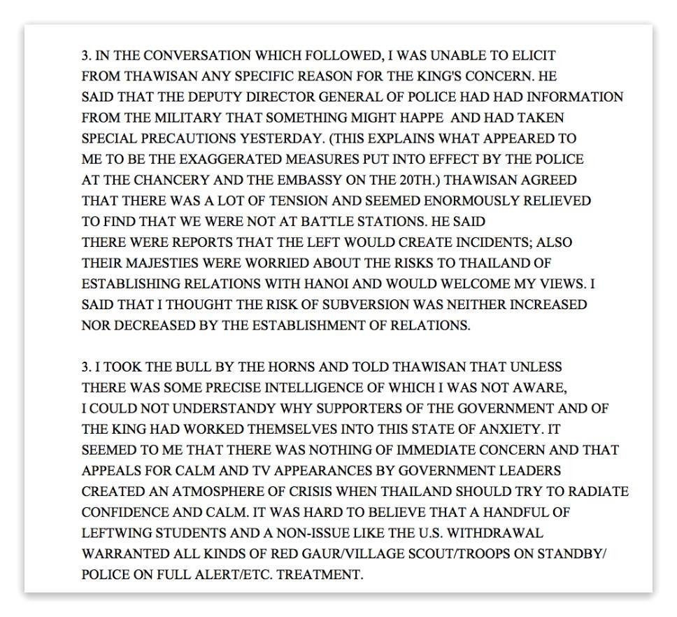 “Thawisan said the king had asked him to get my advice on how Thailand could overcome the false impression which had been given in Europe and America of recent events here. He said the king hoped that there was some way by which the U.S. could explain that the change of government had been brought about as a result of the weakness of the Seni government and the provocative actions of communist-inspired students,” Whitehouse reported in a secret cable.