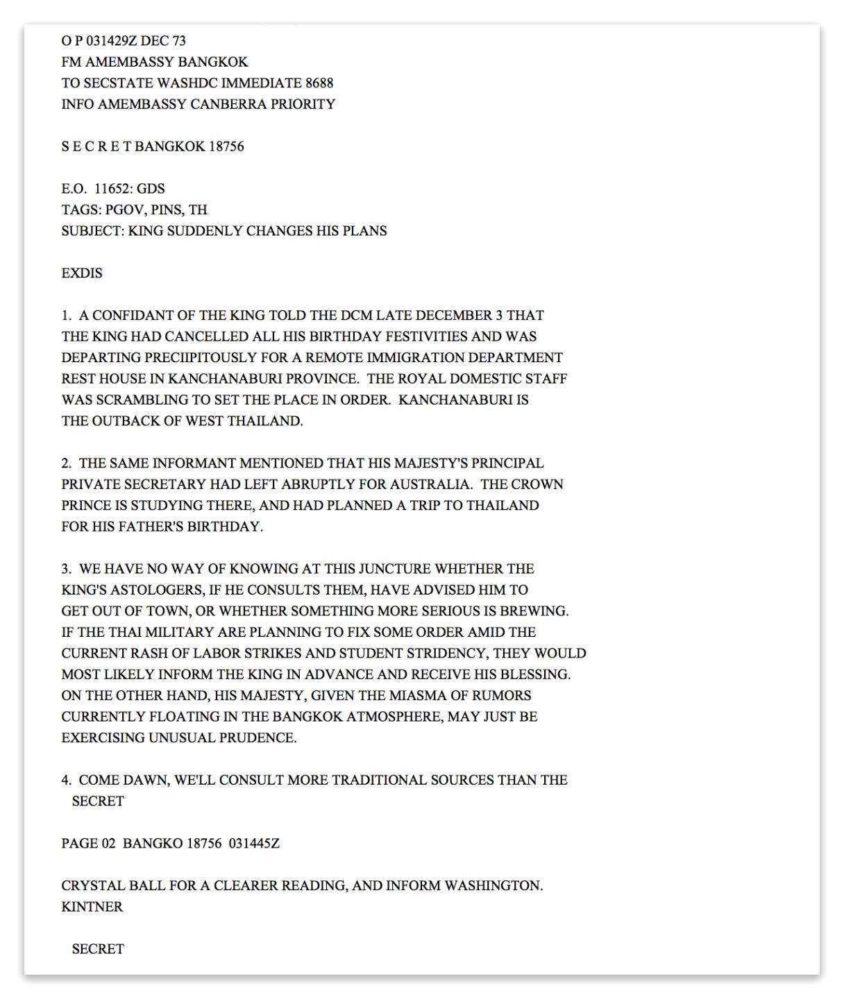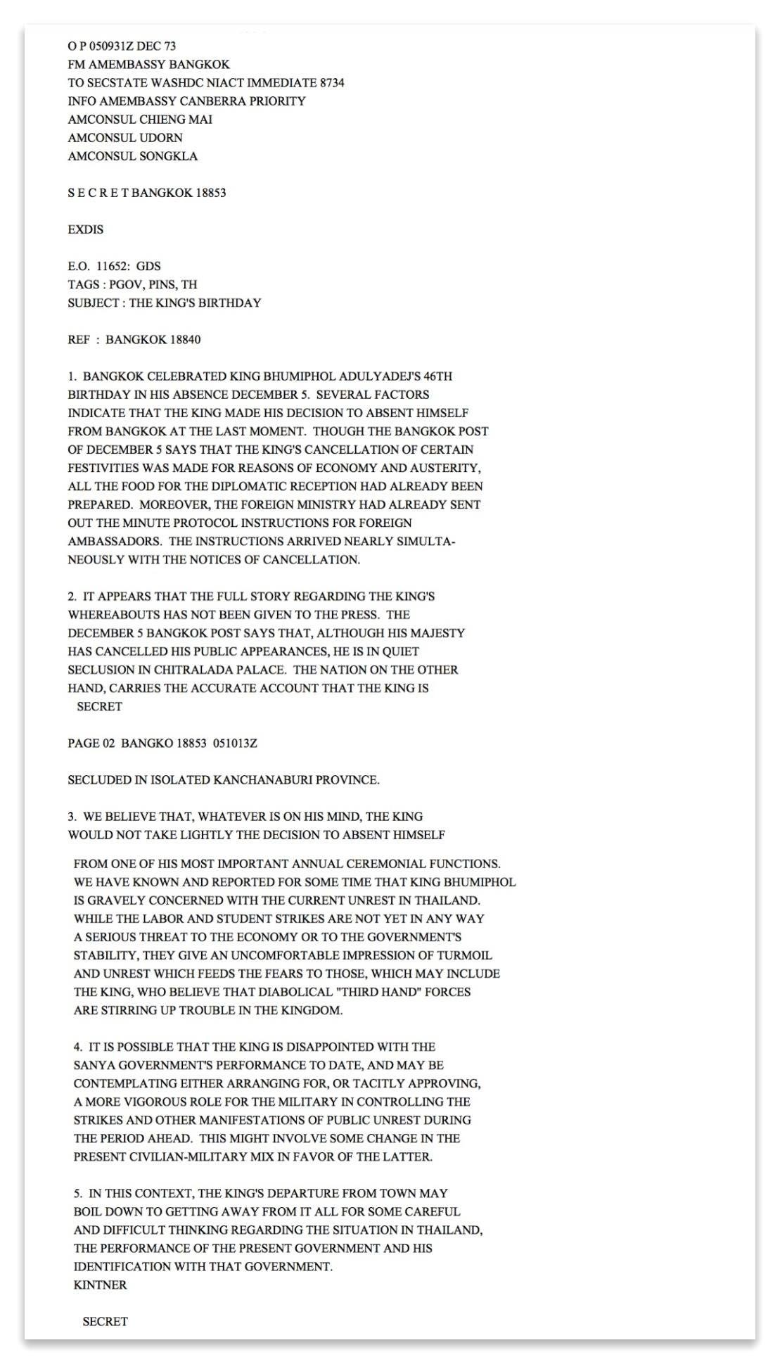 No sensible explanation for Bhumibol’s sudden panic was ever given. In another secret cable on the king’s birthday, December 5, 1973, Kintner speculated that the episode was more evidence that Bhumibol was becoming increasingly paranoid.