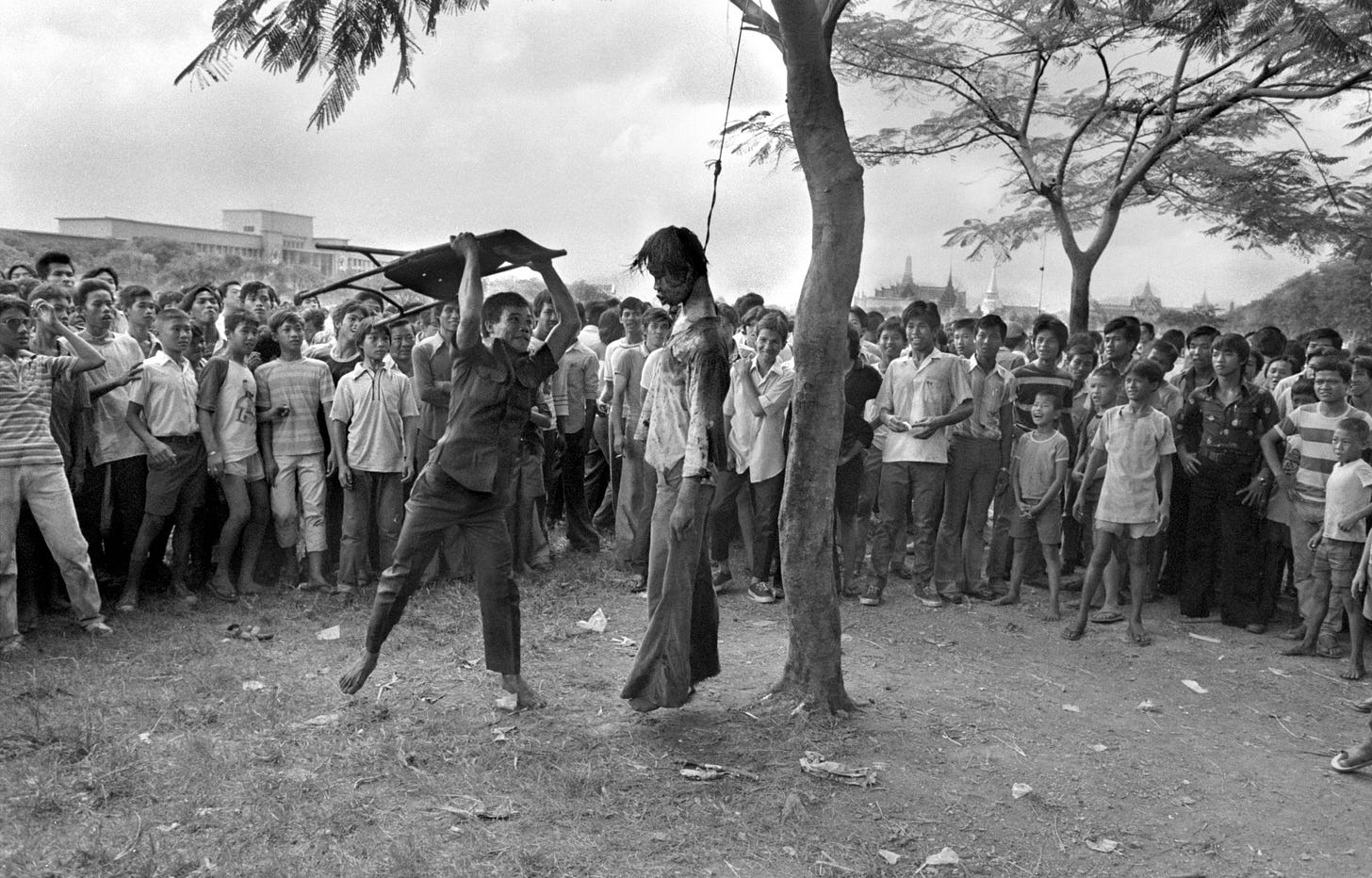 It is a haunting photograph, not just because of the shocking central image, but also because of the unsettling smaller details that emerge as you study it more closely. The rapt faces of the crowd. The joyful glee on the face of the little boy. The rope tied to the other tree in the background, where beyond the frame of the photograph, another corpse is hanging, and another crowd is gawking and cheering, as all around on the royal park and cremation site known as Sanam Luang, other students are being beaten, shot, sexually assaulted, mutilated, murdered and burned alive.
