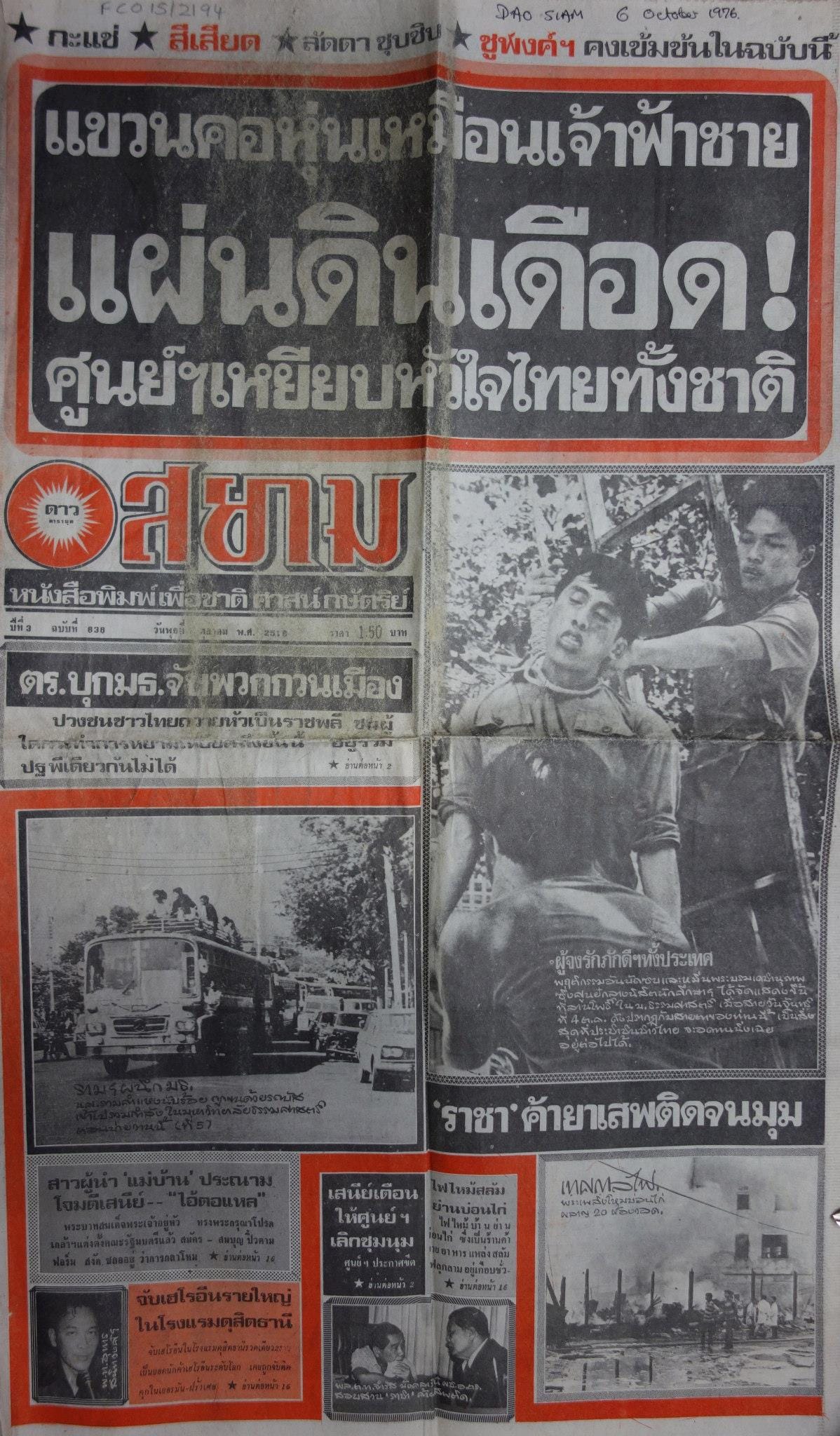 It was late afternoon, and I was still in my university student uniform. I turned on the radio as usual, to listen to music as I lulled my six-month-old niece to sleep in a canvas chair behind the shop. But things were not as usual. A live broadcast from Yan Kraw radio station came on, during which the Department of Public Relations announced that Thammasat University students had performed a play lynching the crown prince.