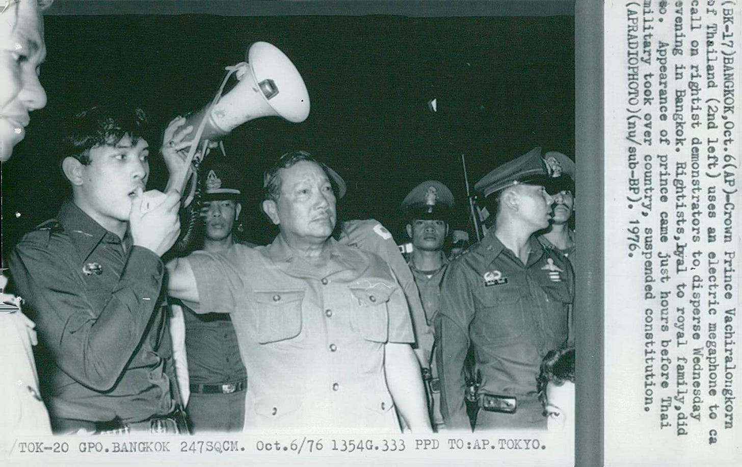 Vajiralongkorn was summoned back from Australia a few days before the massacre, on October 2, 1976, and his role in the events of 1976 remains unclear. He was seen giving support to soldiers and police on October 6 and was at Royal Plaza during the afternoon urging the mob to disperse after the violence was over.