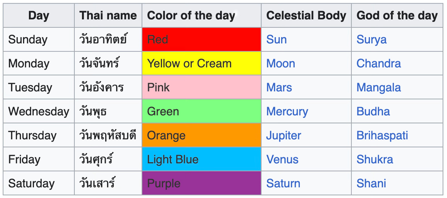 Vajiralongkorn officially wed his fourth wife, former Thai Airways flight attendant Suthida Tidjai, on May 1, 2019, shortly before his formal coronation. She became queen of Thailand. Her colour is purple, because her birthday, June 3, 1978, was a Saturday.