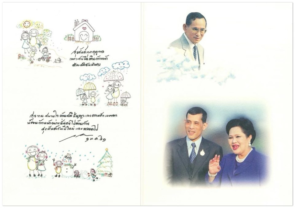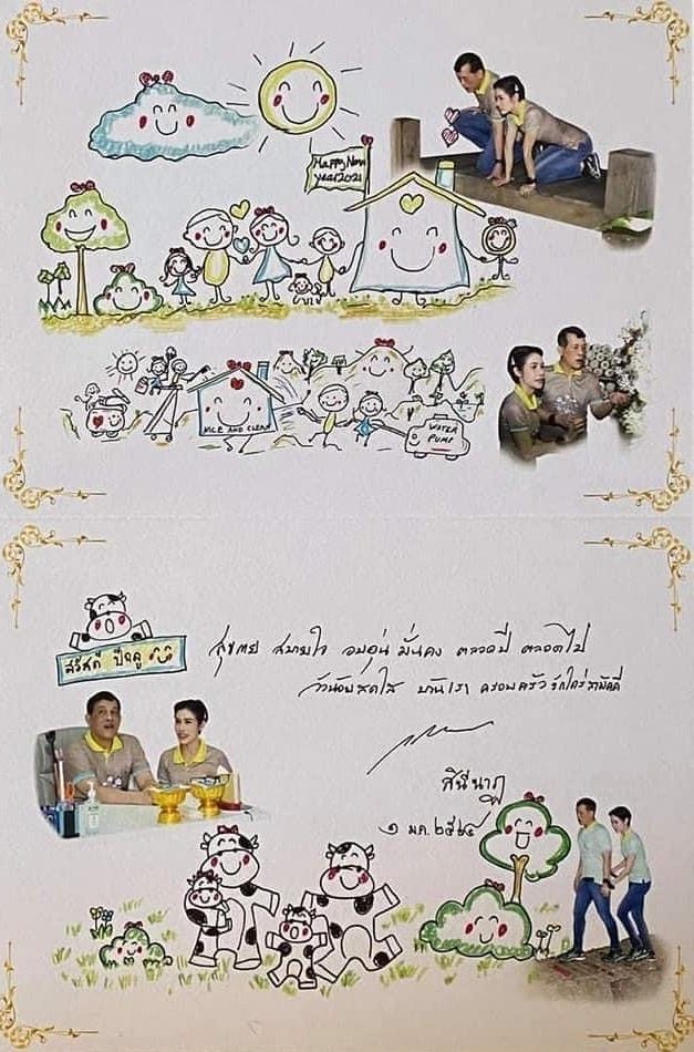 His card for New Year 2021 included photographs of himself and Sineenat, and drawings of a loving couple coloured yellow for the male and light blue for the female, with two children and a white poodle, as usual. A flag flying from a smiling anthropomorphised house declared “Happy New Year 2021” and even a hill in the background was smiling.