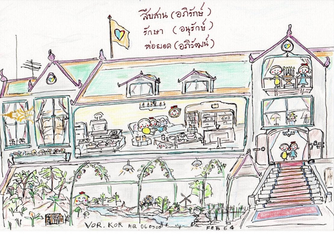 Besides his other favourite pastimes such as cruelty and sadism, cycling, political meddling, collecting planes as garden ornaments, and public semi-nudity, Thailand’s monarch enjoys drawing infantile pictures depicting kitsch sentimental scenes of happy families and social harmony, in which everybody is always smiling — not just humans but clouds, houses, plants, fruit and vegetables, and the sun too.