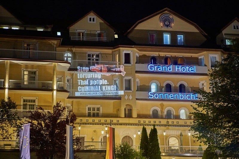 In May 2020, exiled dissident Junya Yimprasert launched a series of protests right outside Vajiralongkorn’s hotel in Bavaria, working with the German activist group PixelHELPER. Messages denouncing Vajiralongkorn and the military regime, and a notorious photograph of the king wearing a crop top, were projected onto the facade of the Grand Hotel Sonnenbichl.