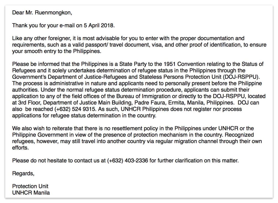Chaloemsak checked in to a backpacker hostel in Manila, and planned to visit the UNHCR when it reopened after the weekend. He made contact with the UNHCR office and received a response.