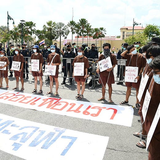 Jailed protest leader Parit “Penguin” Chiwarak has now been on hunger strike for more than 42 days, while his comrade Panusaya “Rung” Sithijirawattanakul has been fasting for more than 28 days. There are grave concerns for Penguin’s health in particular, because the risk of death increases dramatically after about 45 days without food. Penguin’s mother has asked supporters to implore him to end his fast, in a campaign using the hashtag #เธอจะต้องมีชีวิตอยู่ — #YouMustLive. Prominent academics Somsak Jeamteerasakul and Prajak Kongkirati have been among those calling on Penguin and Rung to resume eating rather than risk dying.